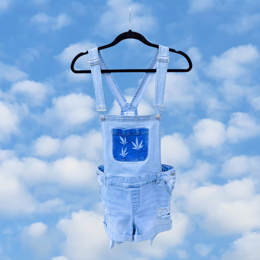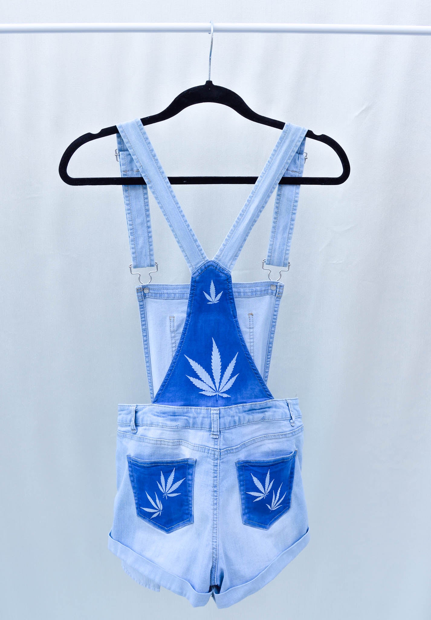 Introducing my one-of-a-kind upcycled denim overalls, designed and dyed with unique real cannabis leaves to showcase your love for the plant. These overalls are sustainably made using repurposed Wax Jean brand denim, ensuring that you're not only looking great but also doing your part for the environment.