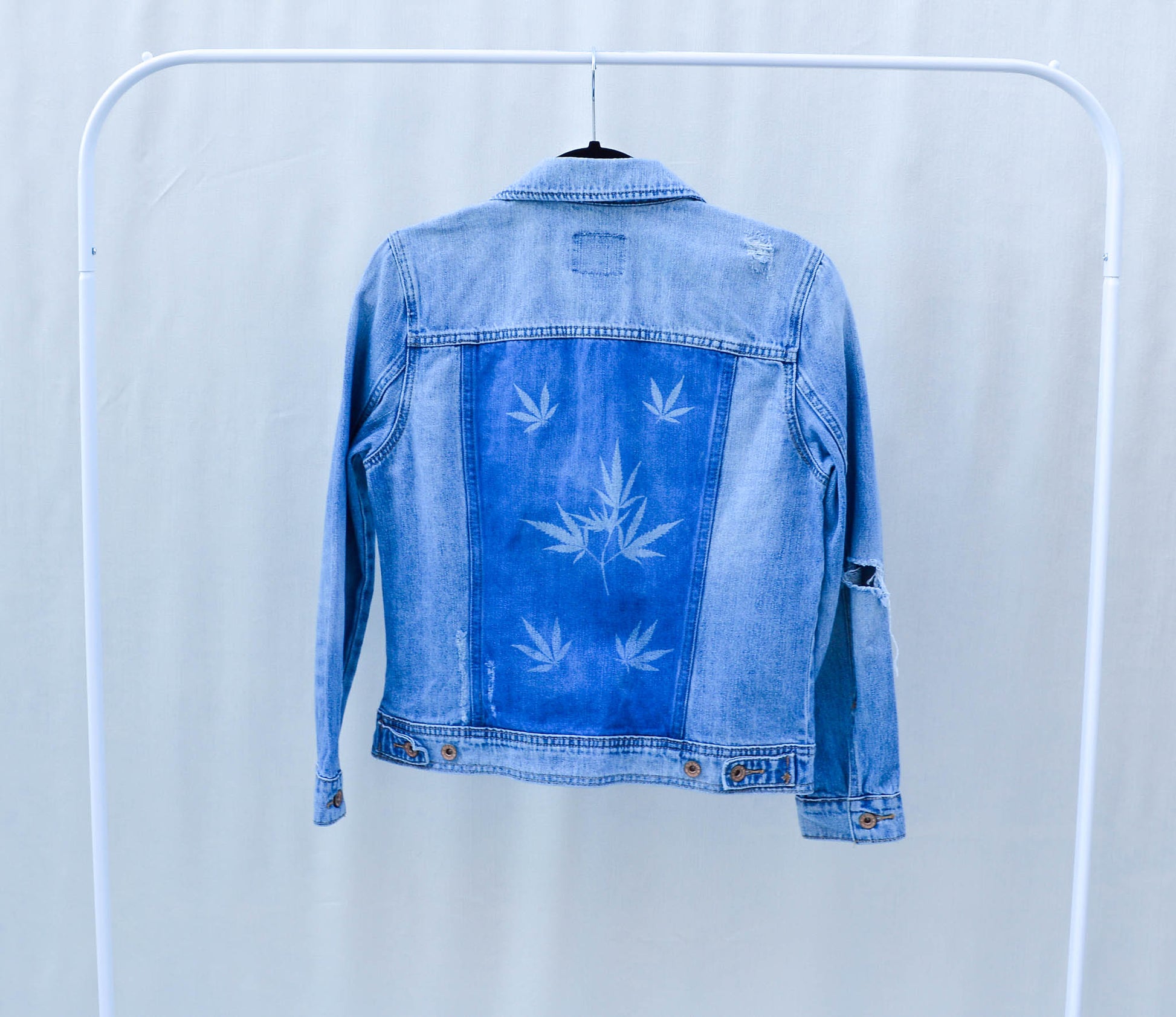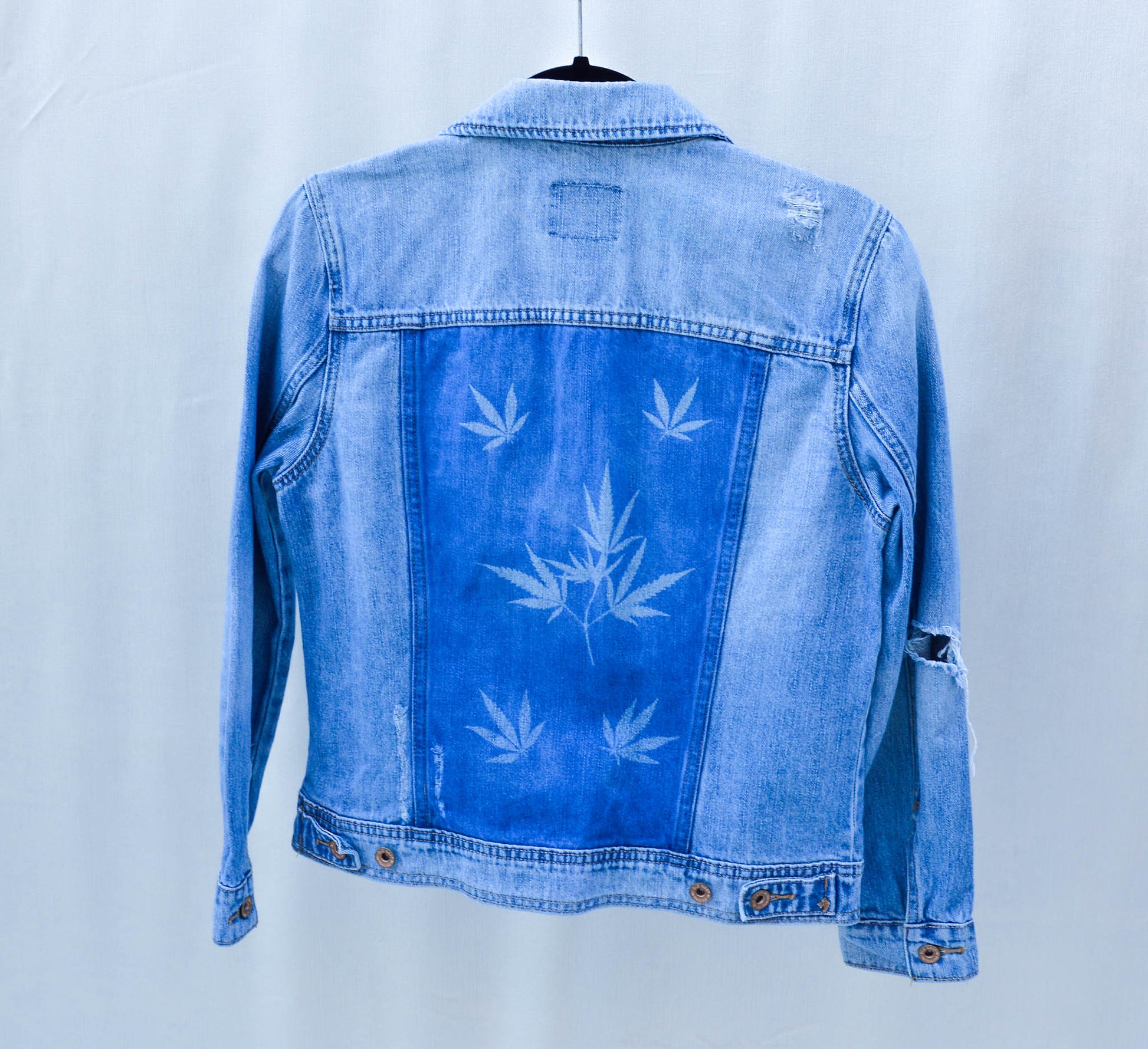 Introducing my one-of-a-kind upcycled denim jacket, designed and dyed with unique real cannabis leaves to showcase your love for the plant. This jacket is sustainably made using repurposed Old Navy brand denim, ensuring that you're not only looking great but also doing your part for the environment.