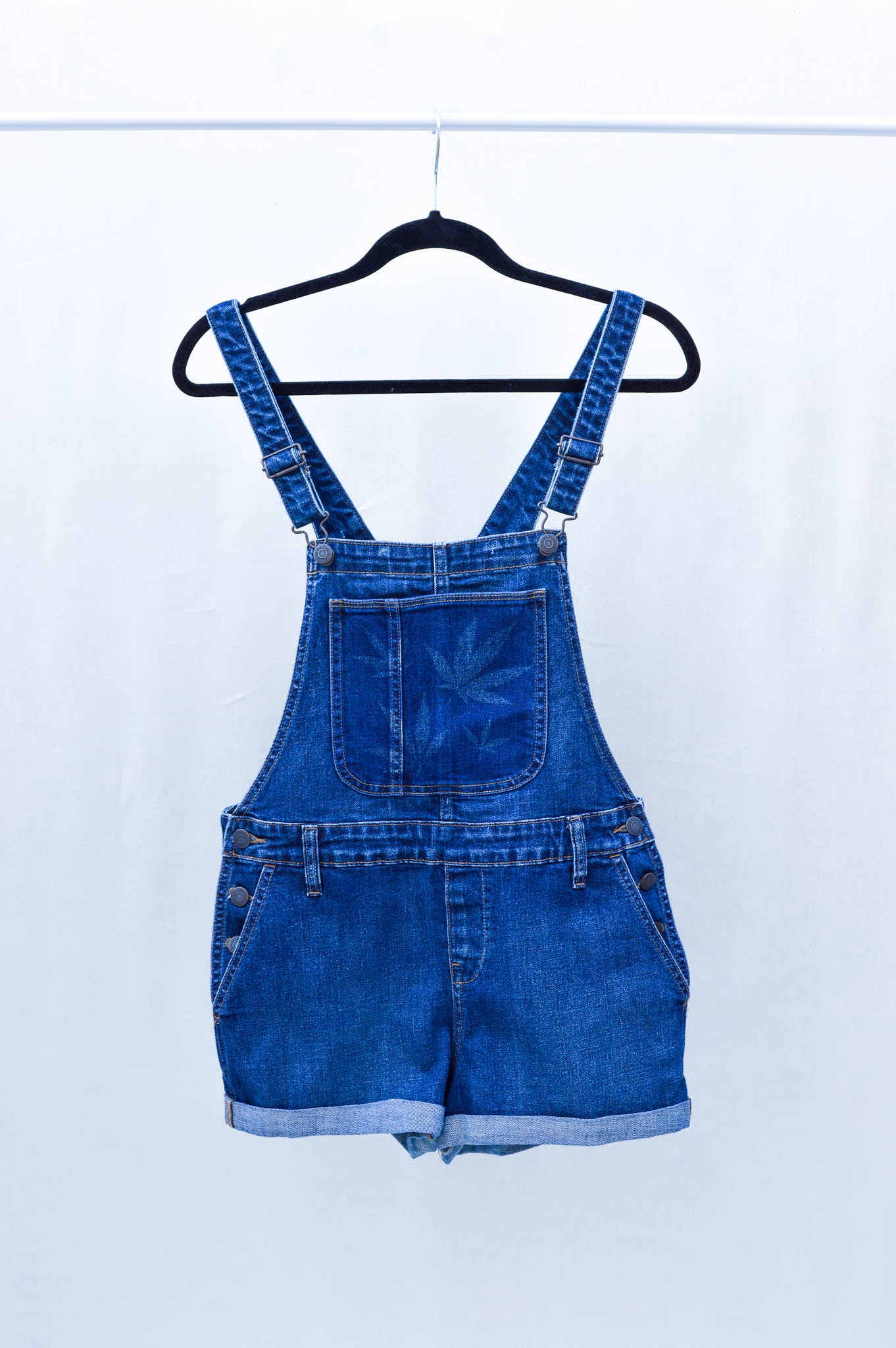 Introducing my one-of-a-kind upcycled denim overalls, designed and dyed with unique real cannabis leaves to showcase your love for the plant. These overalls are sustainably made using repurposed Old Navy brand denim, ensuring that you're not only looking great but also doing your part for the environment.