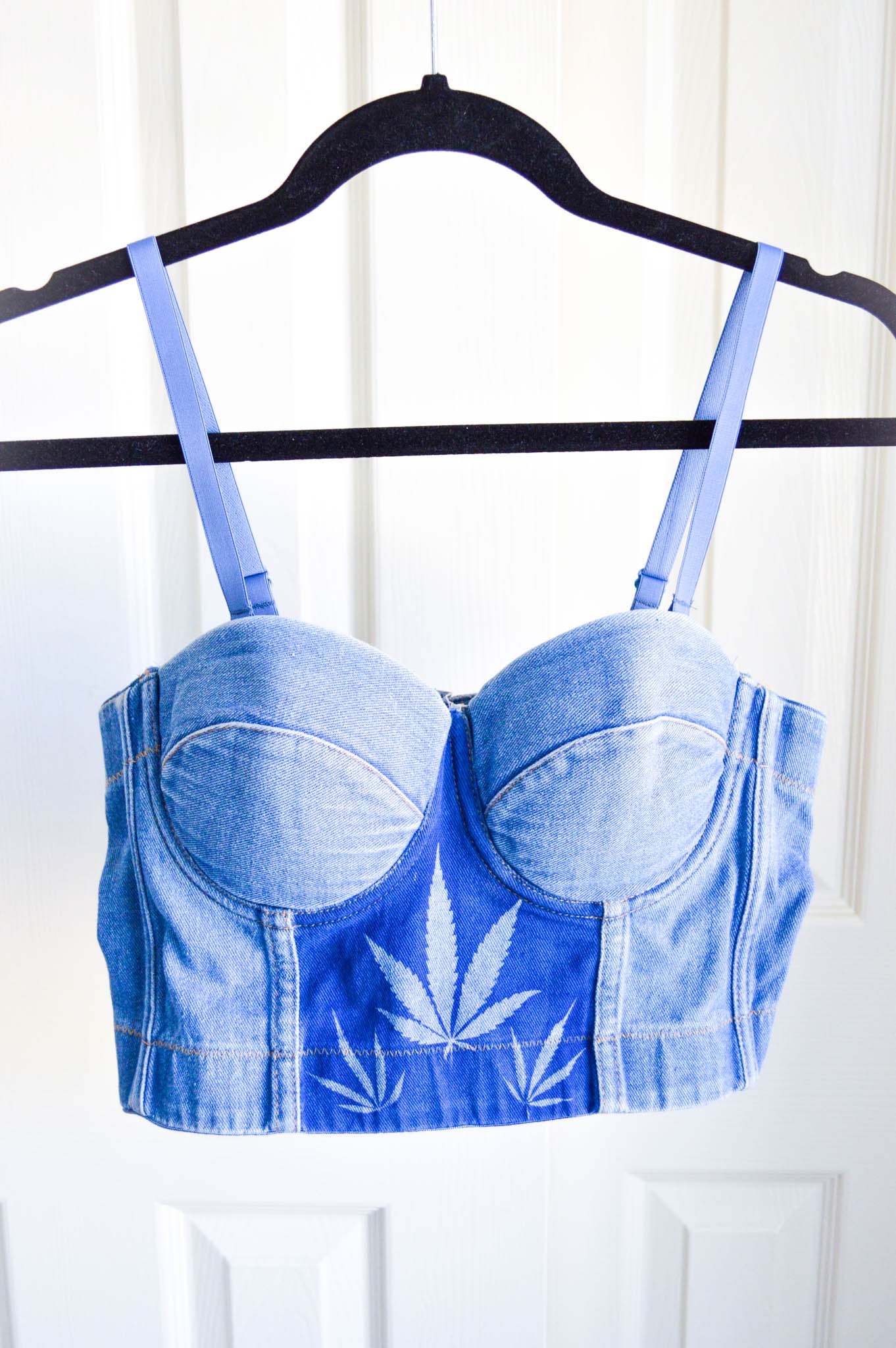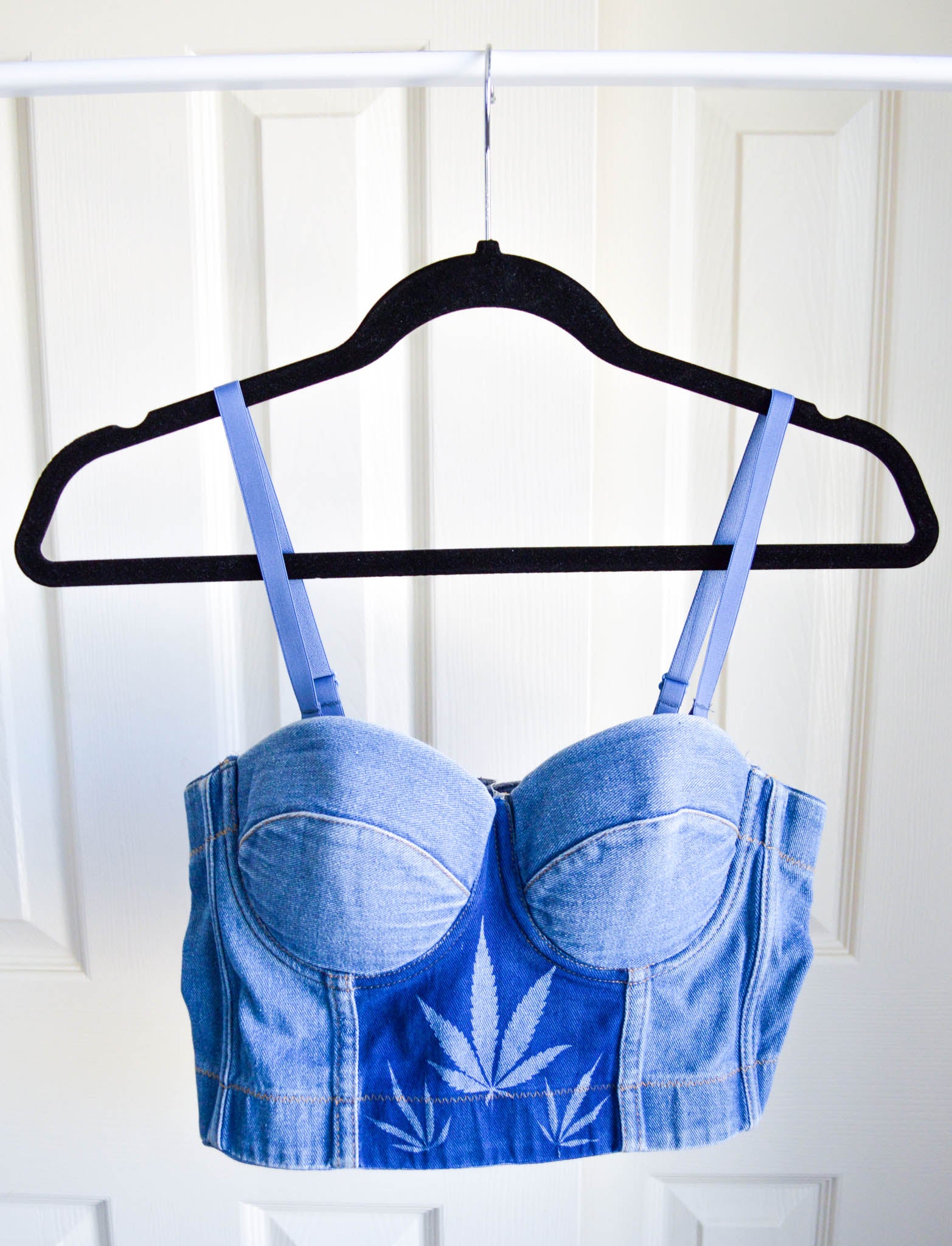 The top measures 29" waist, 9" in length, and 31" bust, with removable and adjustable straps, ensuring a comfortable fit for a range of body types. The cannabis-inspired design is hand-dyed onto the denim, making each piece truly unique and one-of-a-kind.