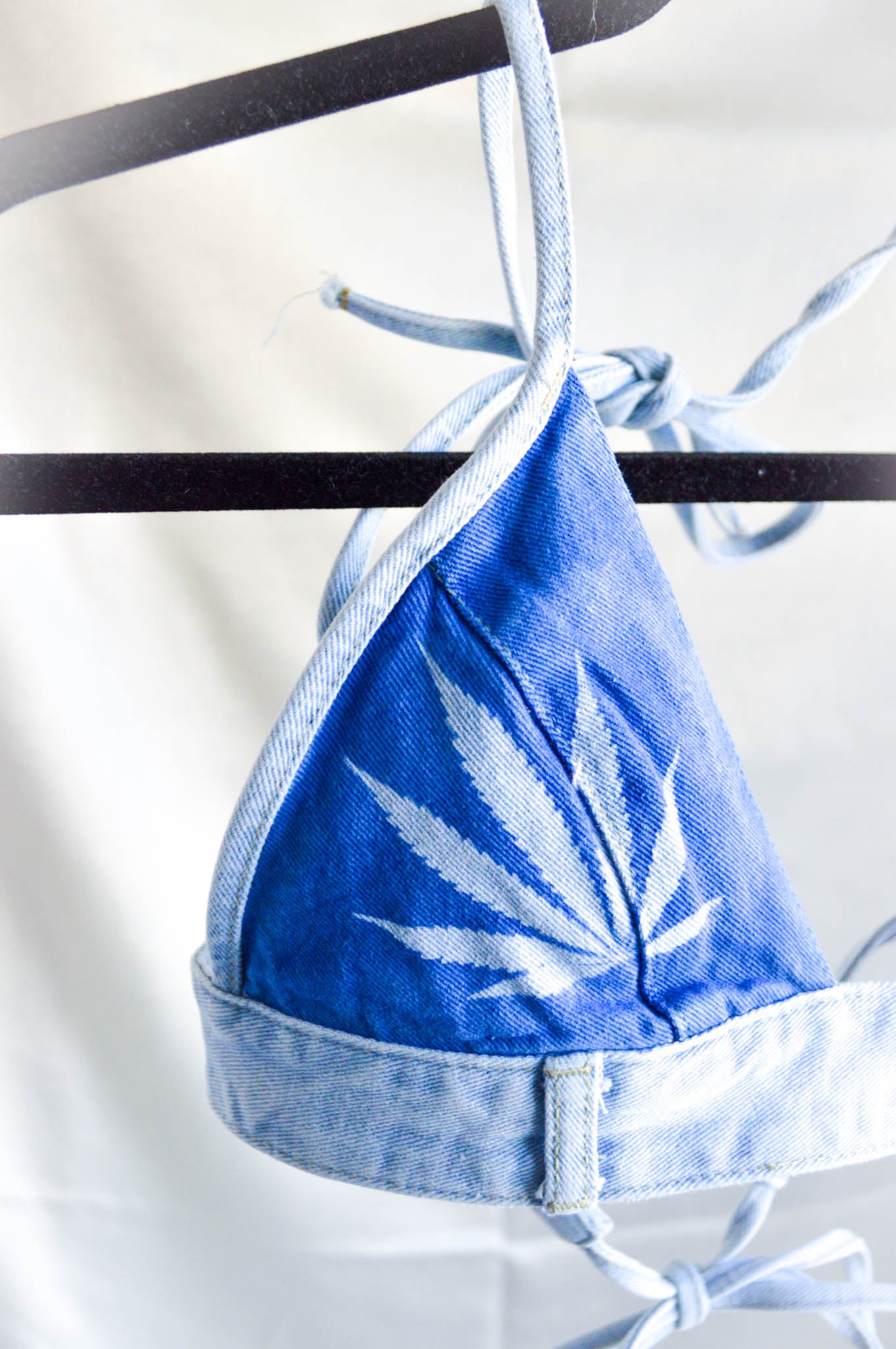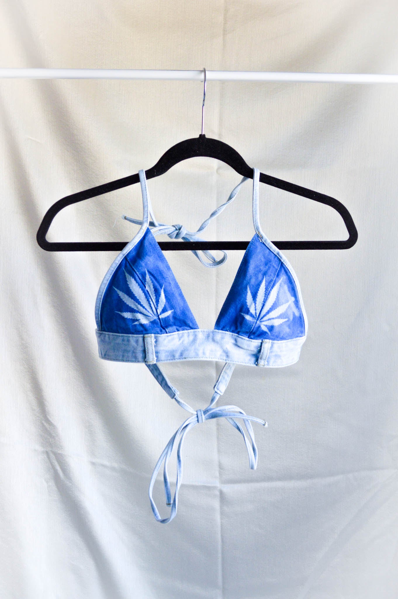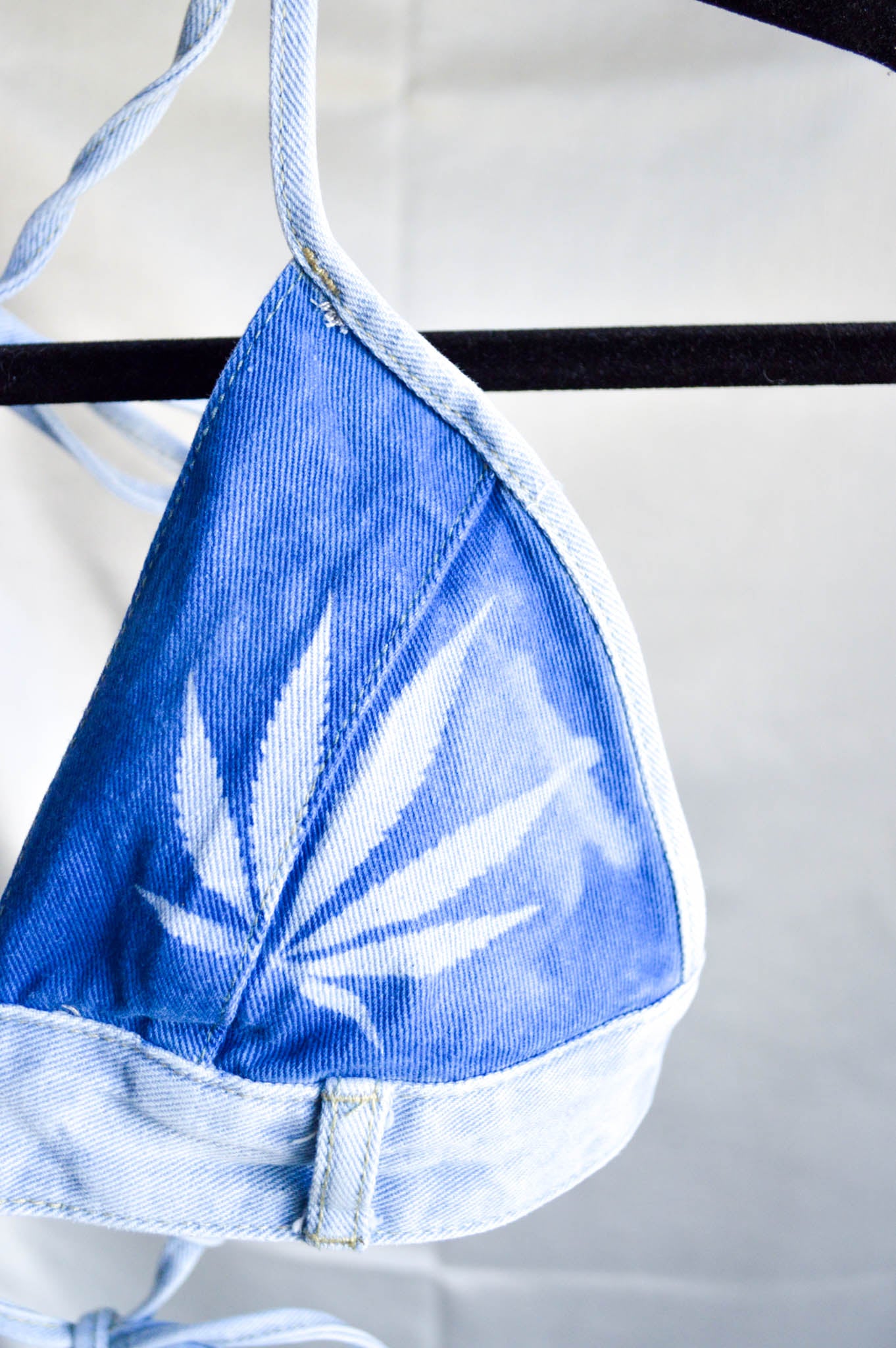 Introducing my one-of-a-kind upcycled denim bikini top, designed and dyed with unique real cannabis leaves to showcase your love for the plant. This top is sustainably made using repurposed denim sourced from Buffalo Exchange, ensuring that you're not only looking great but also doing your part for the environment.