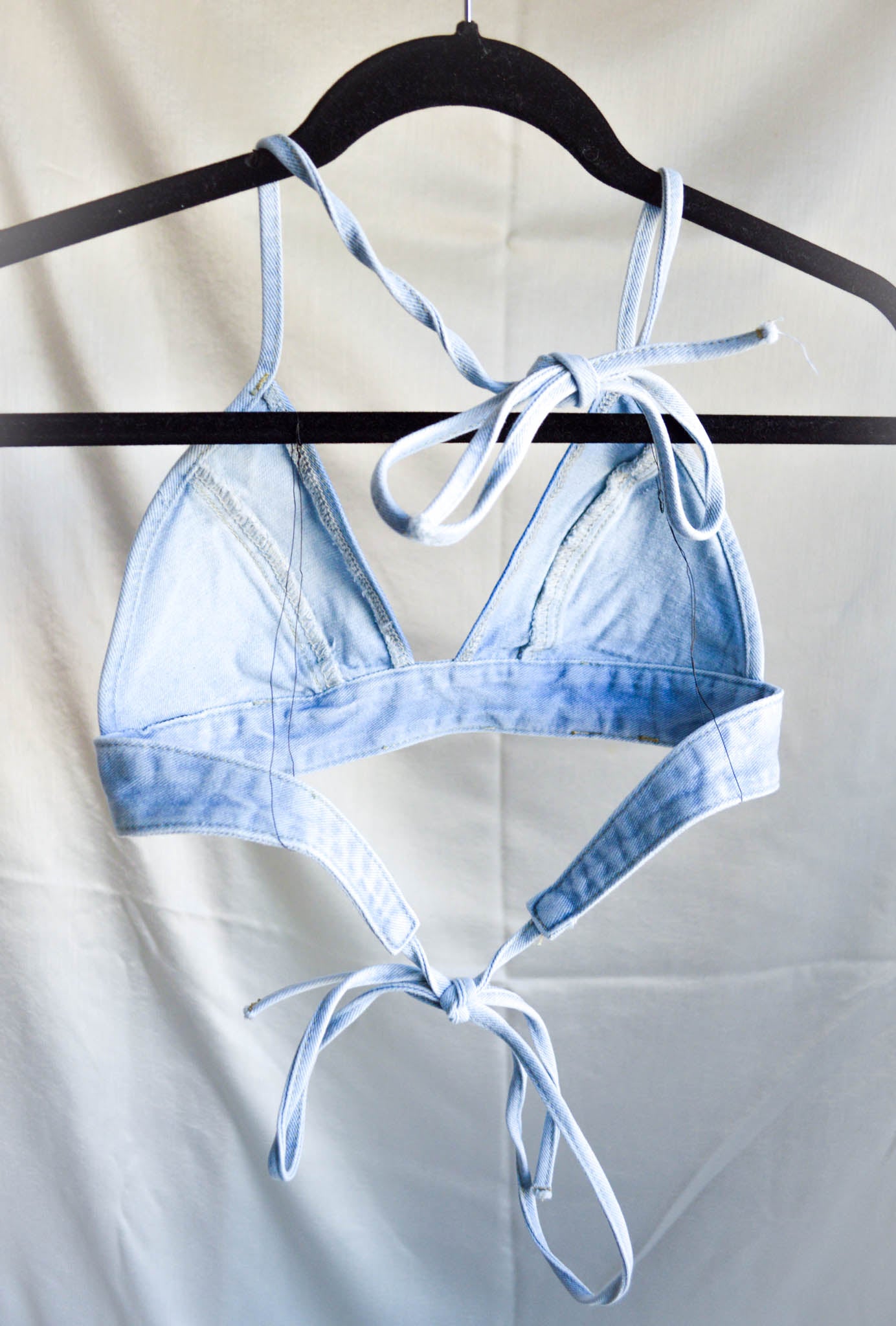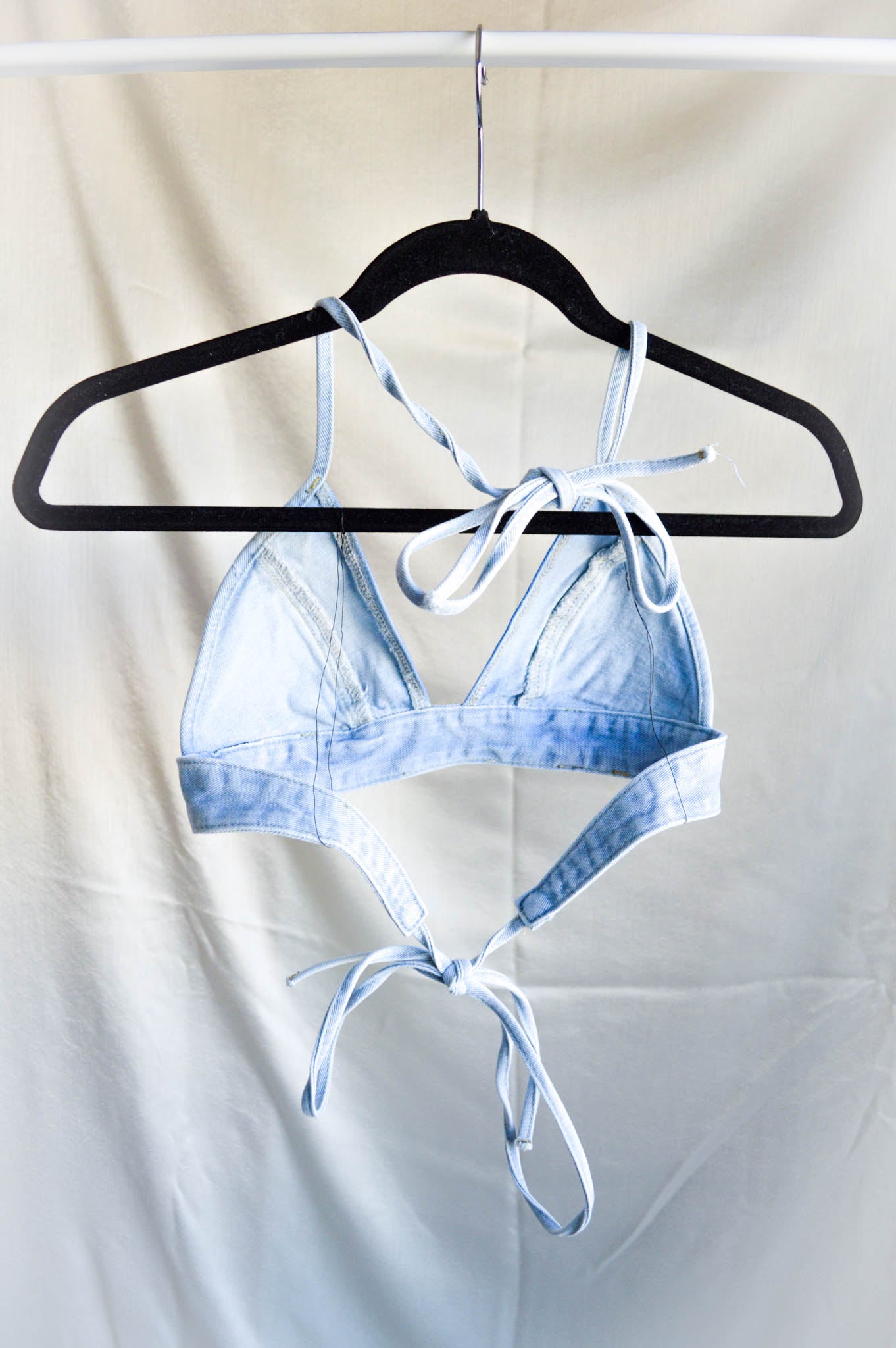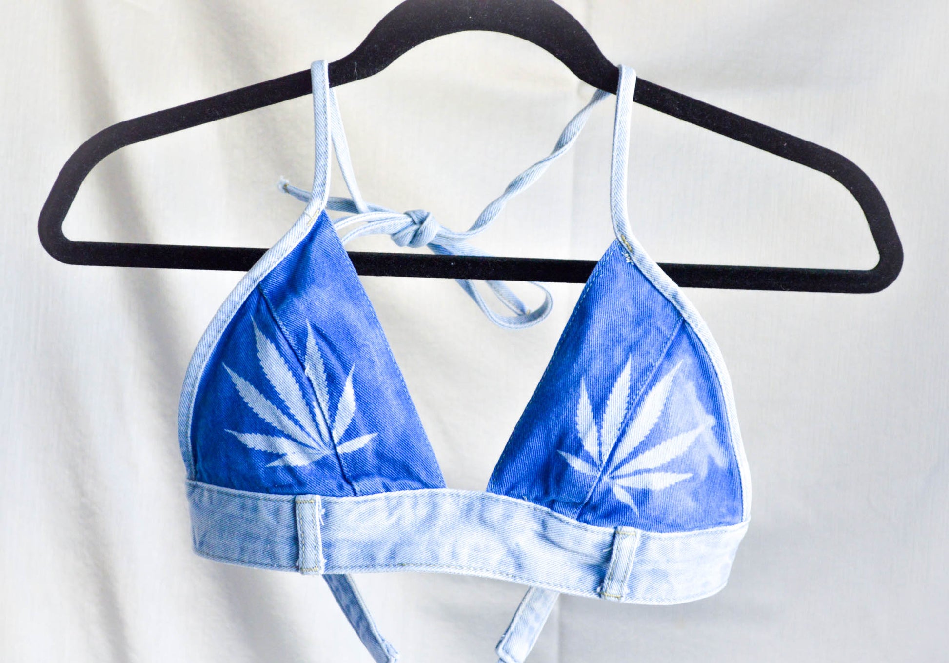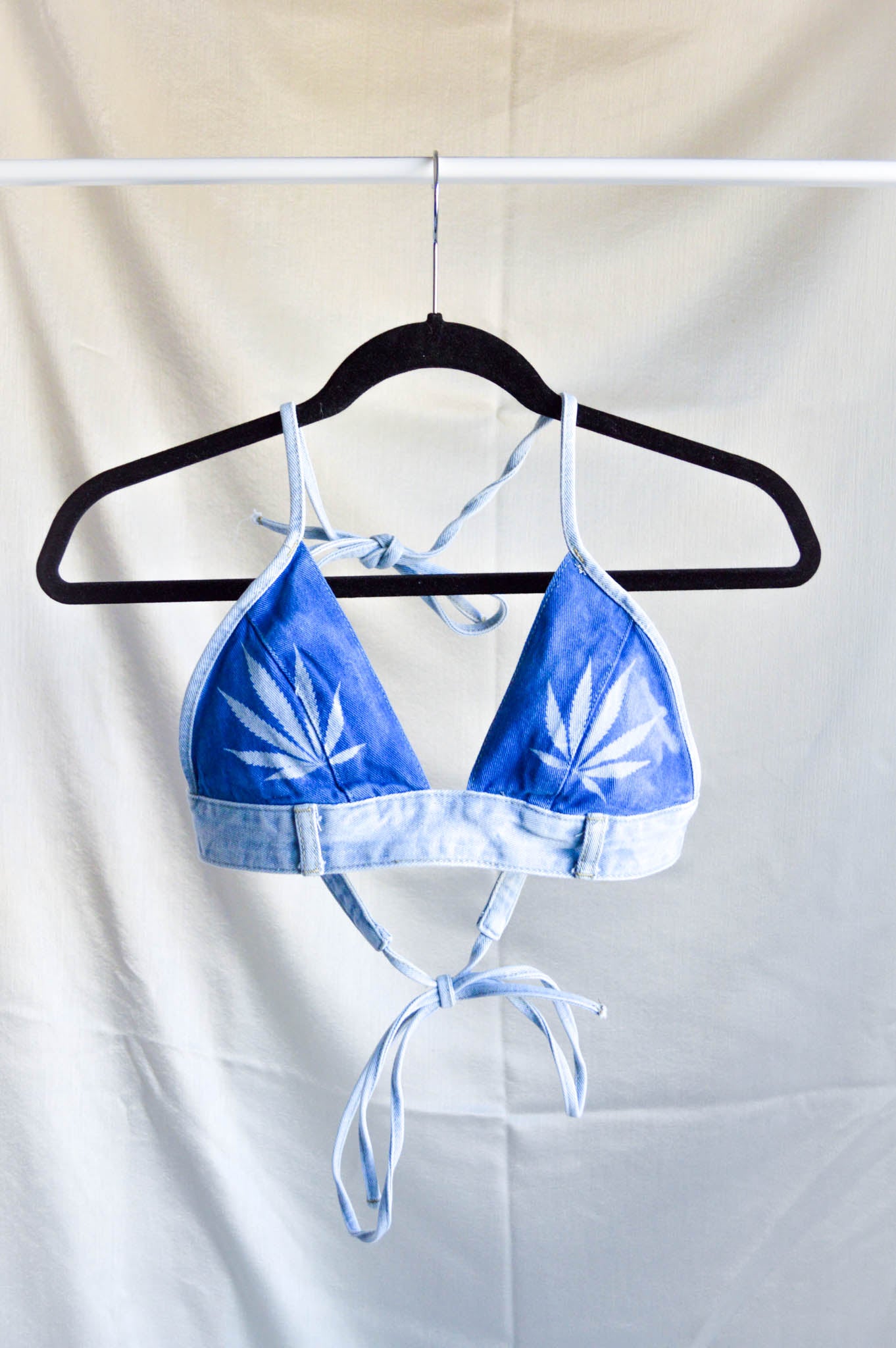 Introducing my one-of-a-kind upcycled denim bikini top, designed and dyed with unique real cannabis leaves to showcase your love for the plant. This top is sustainably made using repurposed denim sourced from Buffalo Exchange, ensuring that you're not only looking great but also doing your part for the environment.
