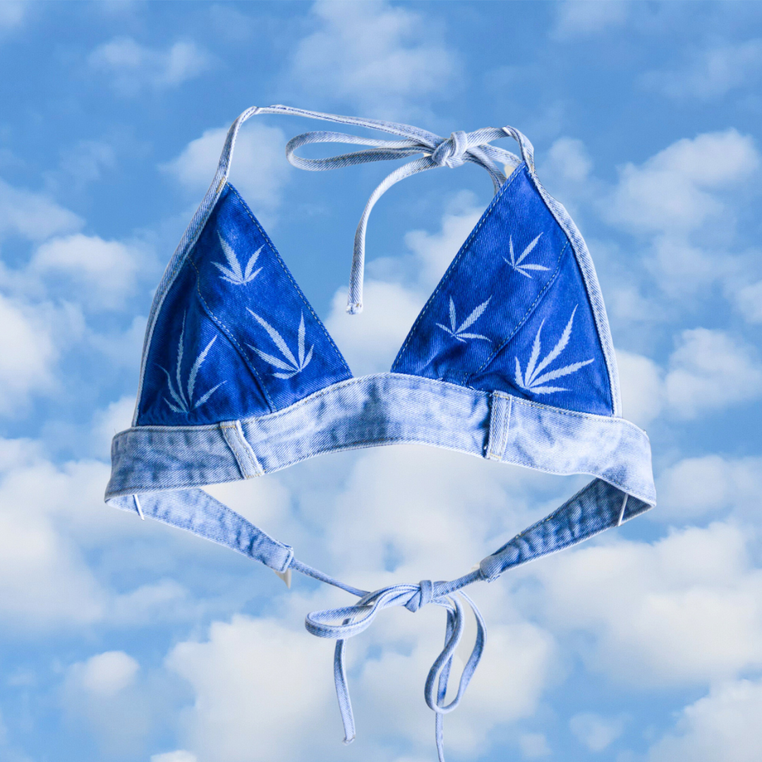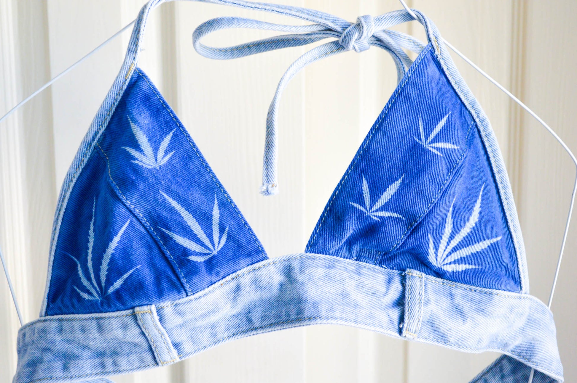 Introducing my one-of-a-kind upcycled denim bikini top, designed and dyed with unique real cannabis leaves to showcase your love for the plant. This top is sustainably made using repurposed denim sourced from Buffalo Exchange, ensuring that you're not only looking great but also doing your part for the environment.