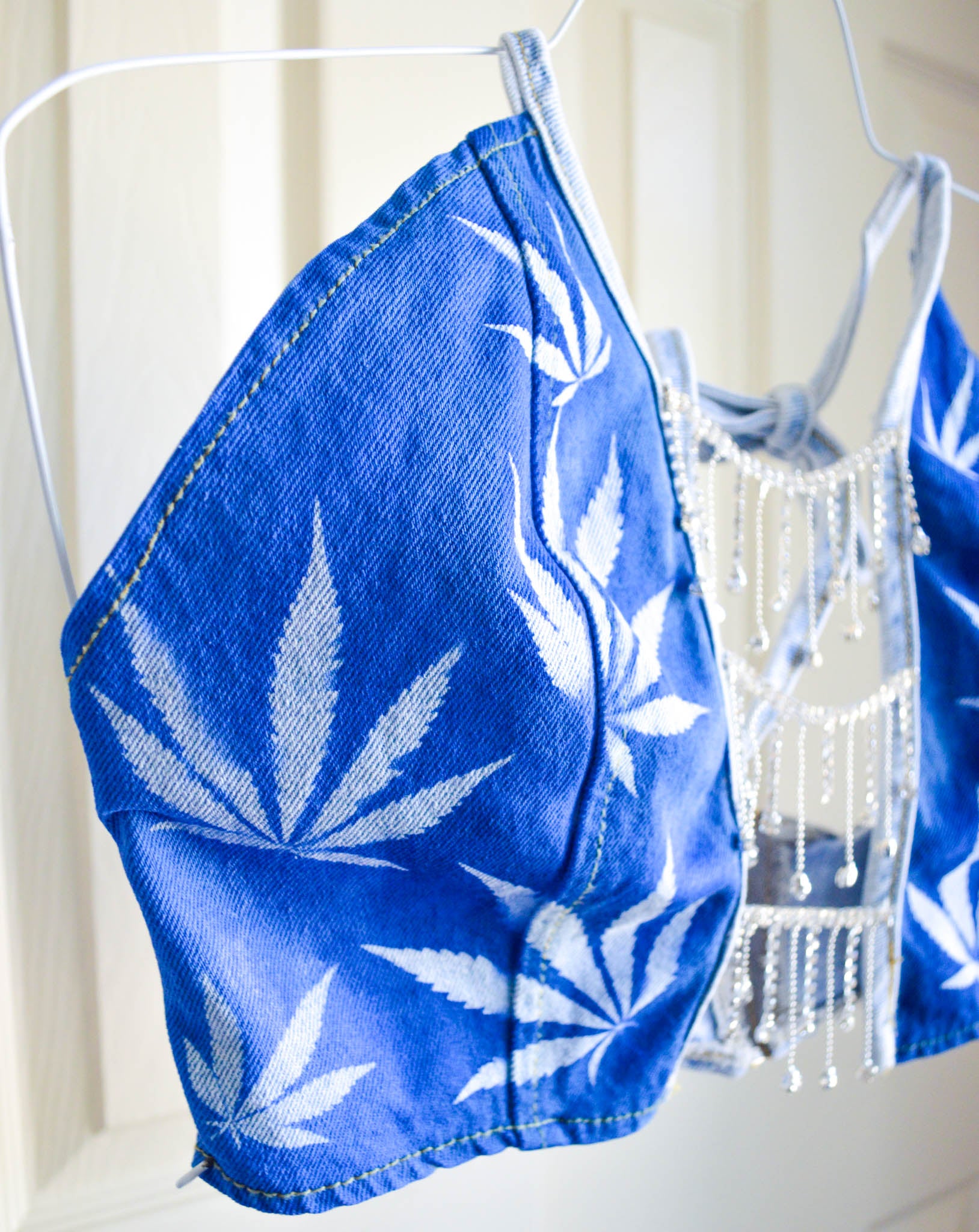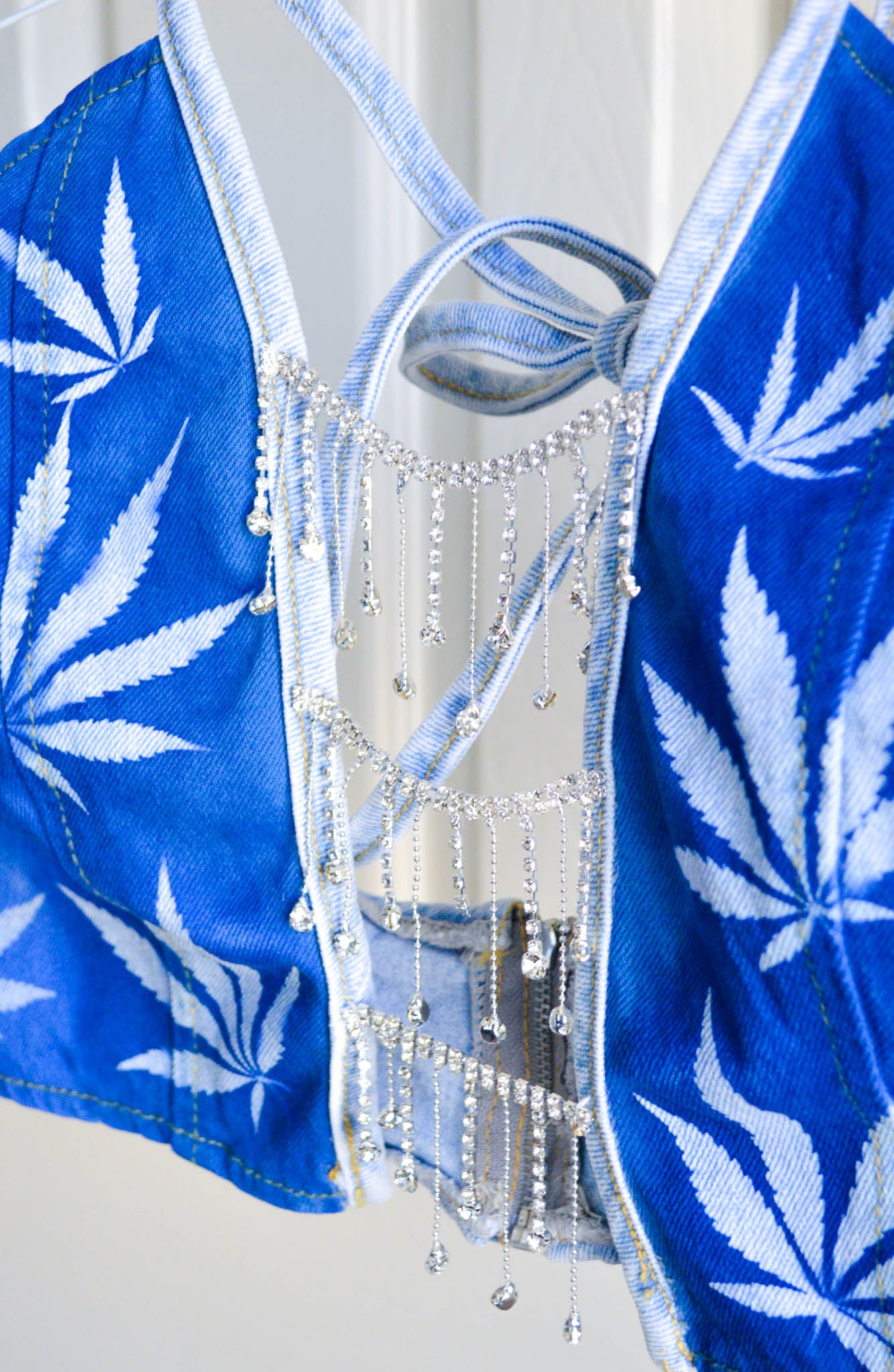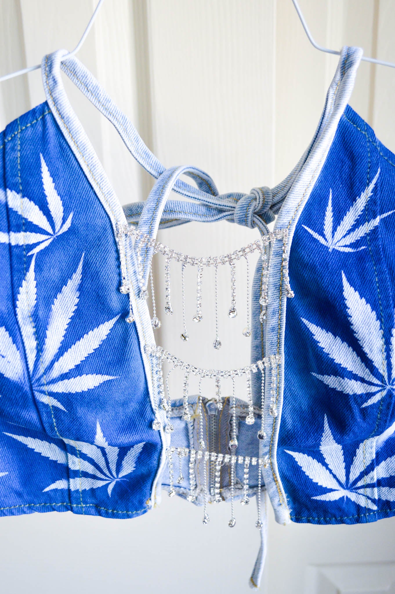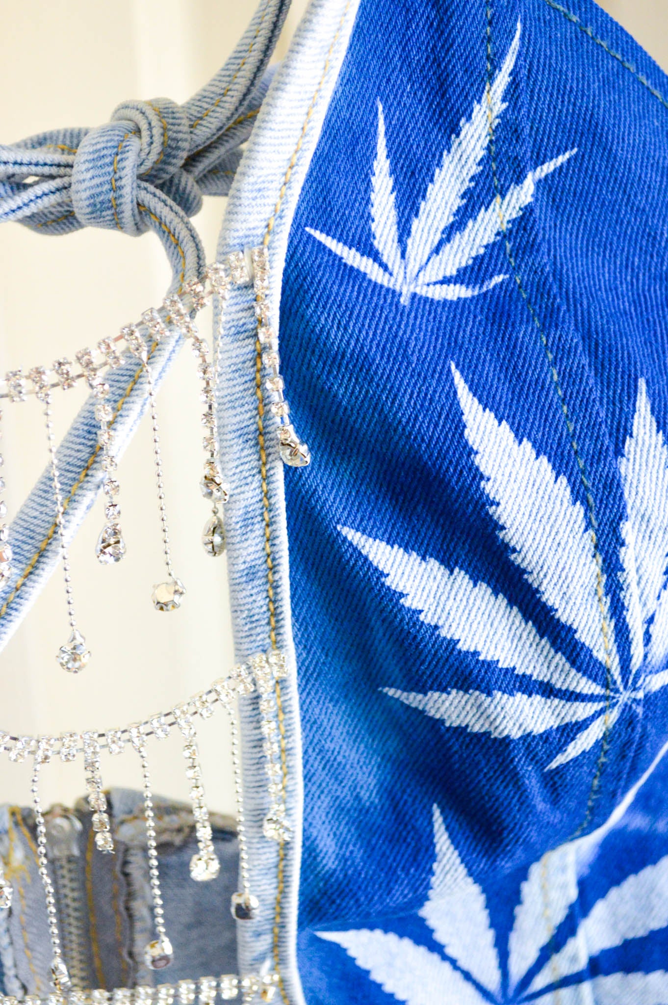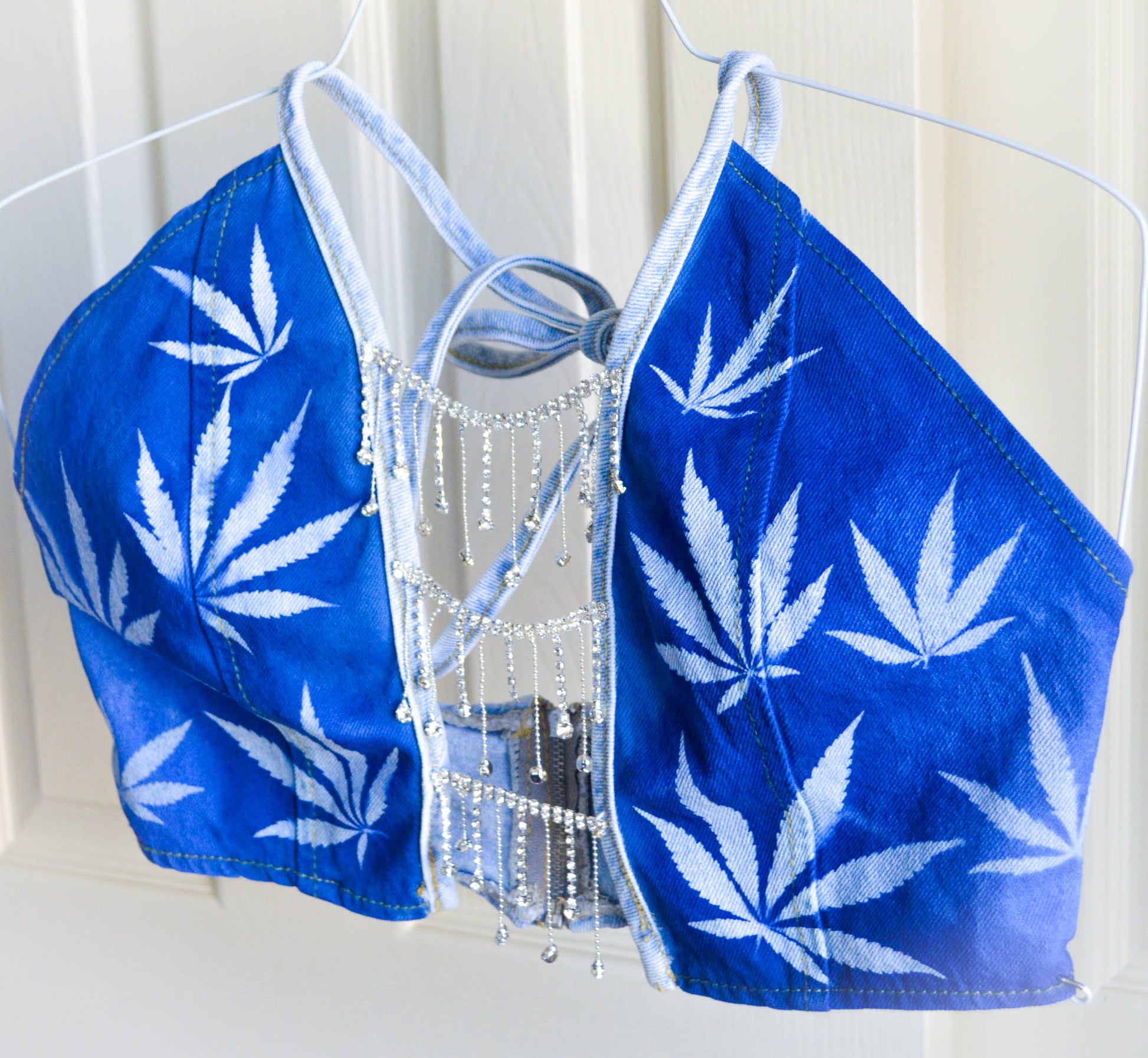 The top measures 32.5" bust, 11" in length from top down, with an adjustable tie at the top, ensuring a comfortable fit for a range of body types. The cannabis-inspired design is hand-dyed onto the denim, making each piece truly unique and one-of-a-kind.