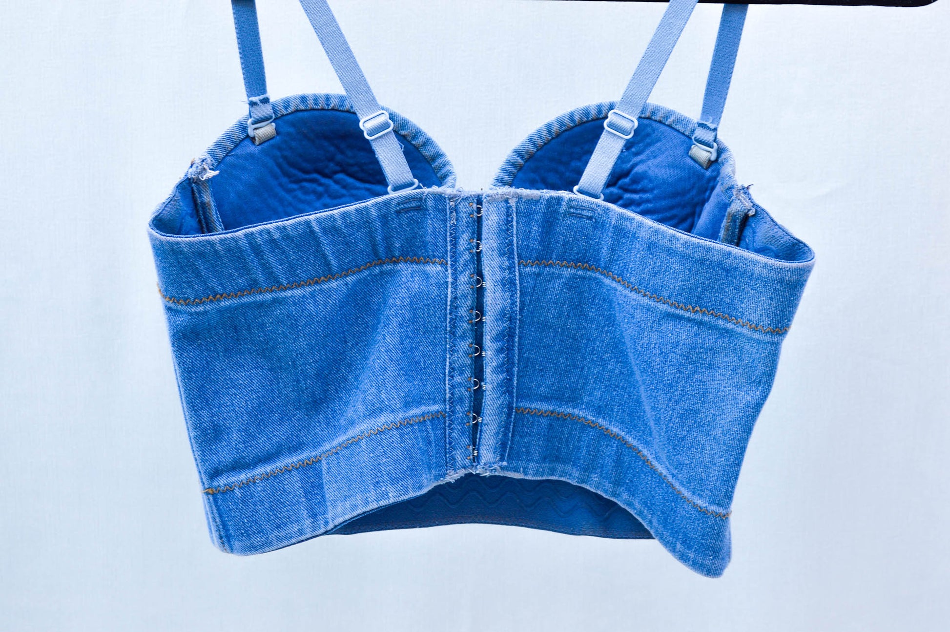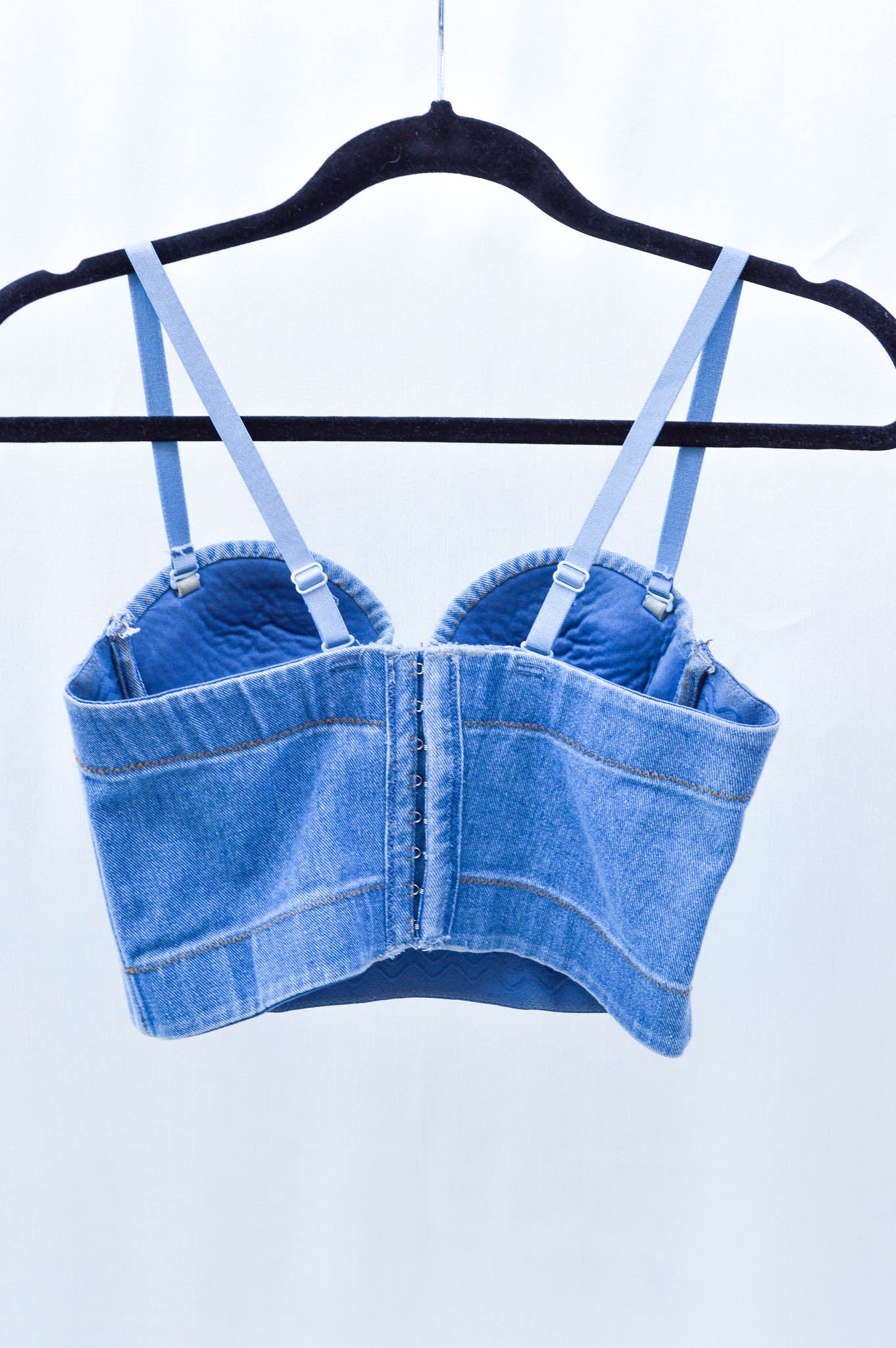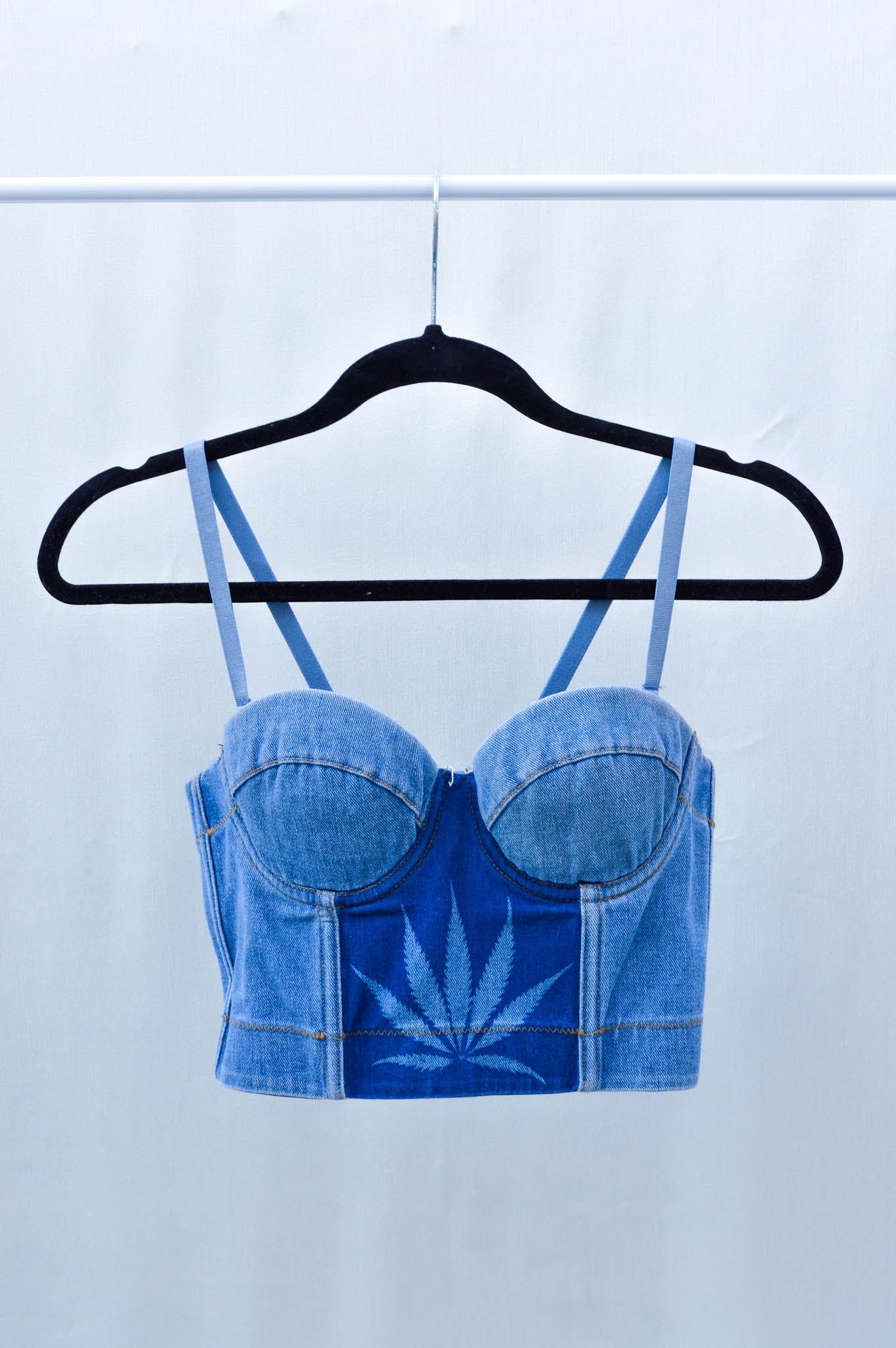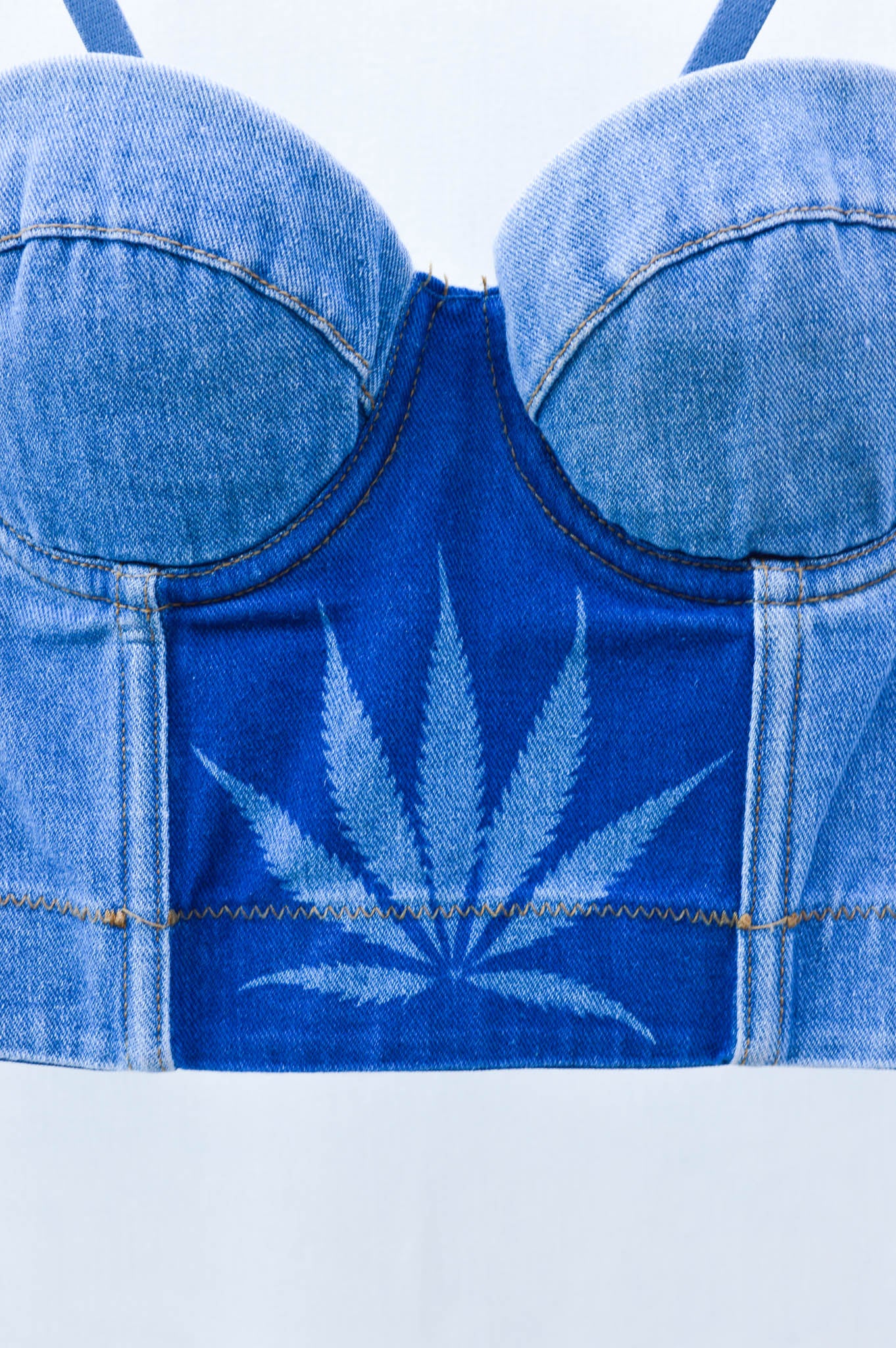 The top measures 27" waist, 7" in length, and 29.5" bust, with removable and adjustable straps, ensuring a comfortable fit for a range of body types. The cannabis-inspired design is hand-dyed onto the denim, making each piece truly unique and one-of-a-kind.