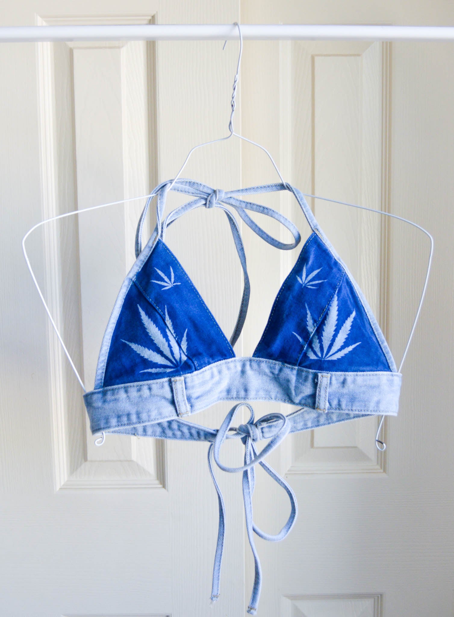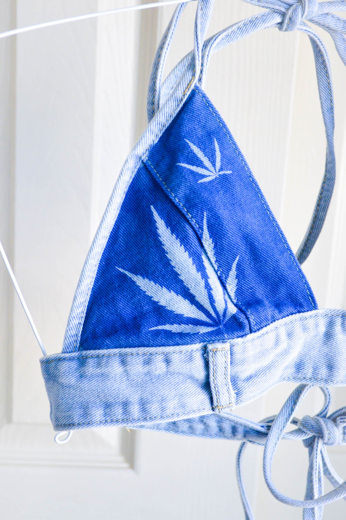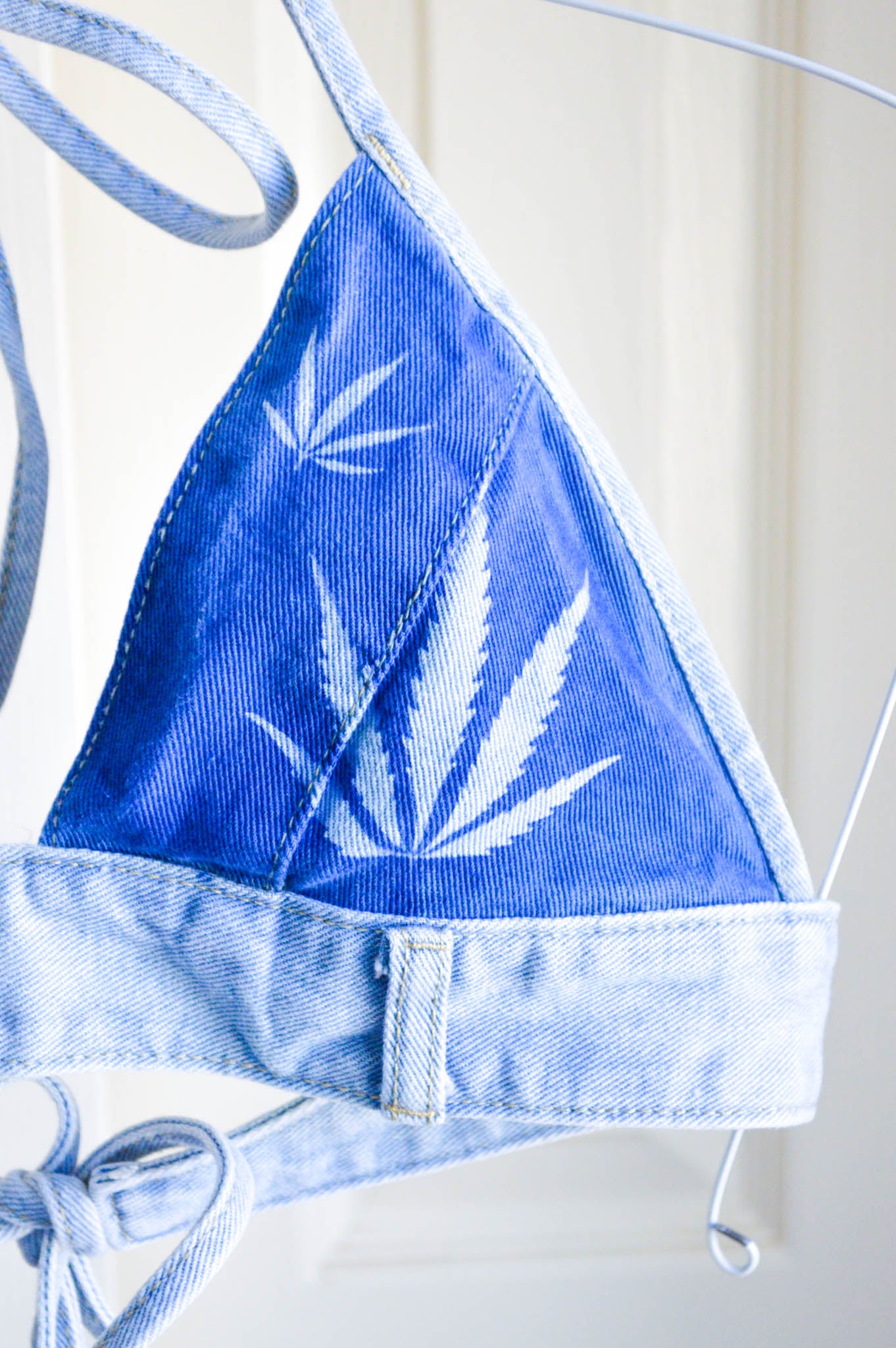 Introducing my one-of-a-kind upcycled denim bikini top, designed and dyed with unique real cannabis leaves to showcase your love for the plant. This top is sustainably made using repurposed denim sourced from Buffalo Exchange, ensuring that you're not only looking great but also doing your part for the environment.
