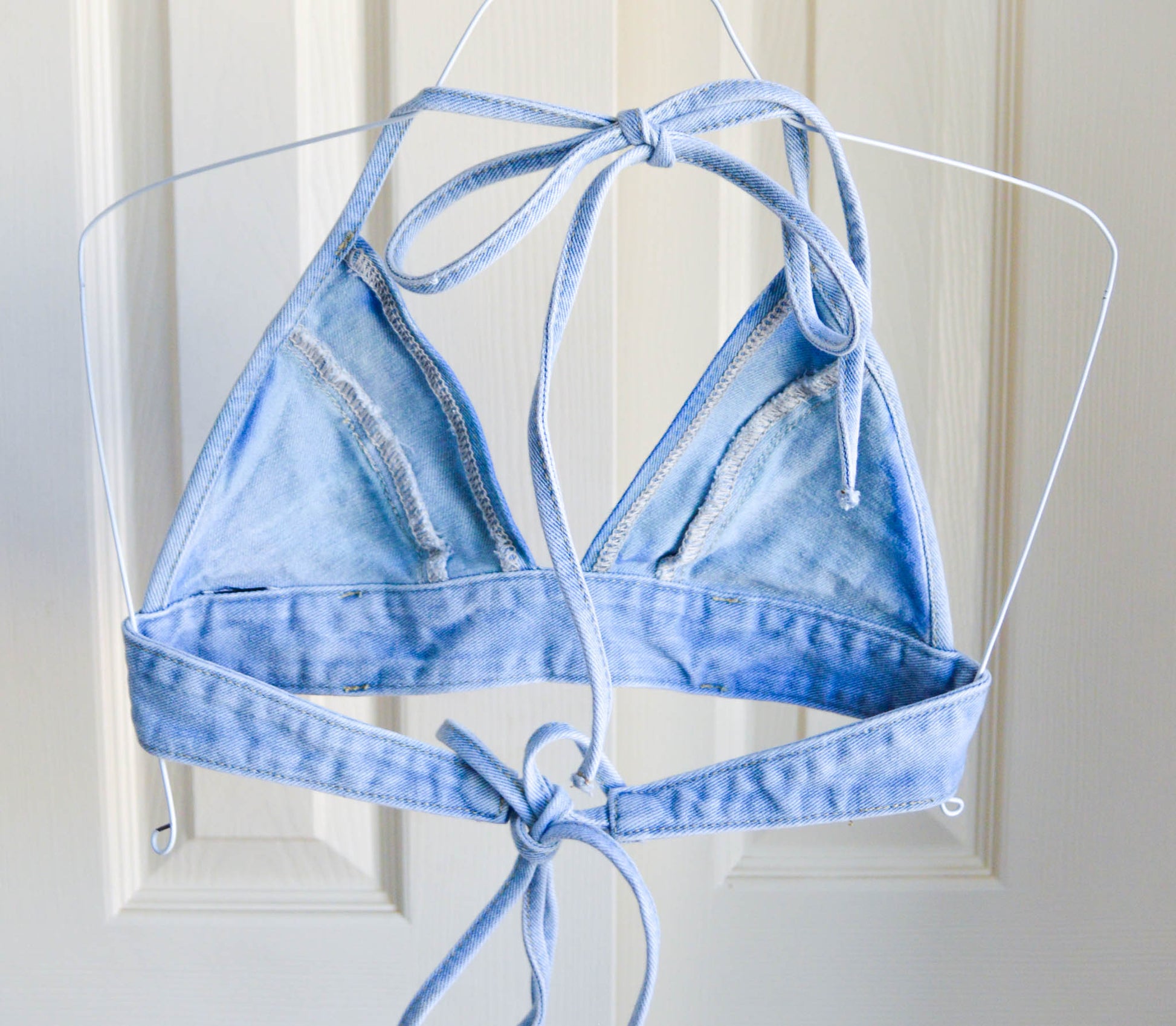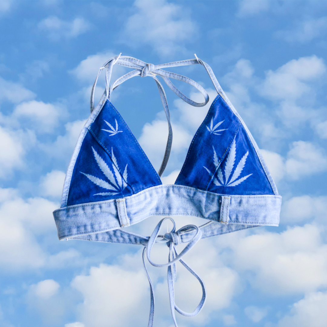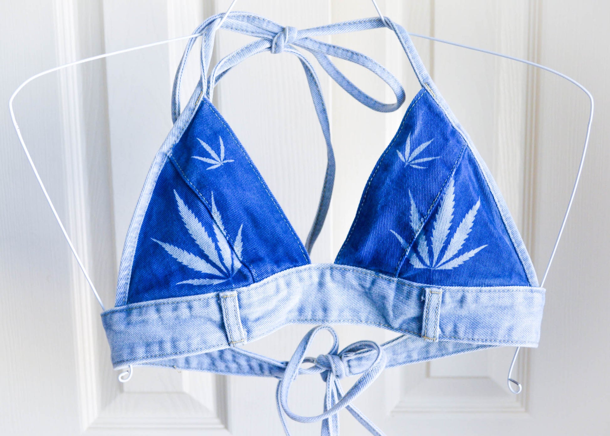 Introducing my one-of-a-kind upcycled denim bikini top, designed and dyed with unique real cannabis leaves to showcase your love for the plant. This top is sustainably made using repurposed denim sourced from Buffalo Exchange, ensuring that you're not only looking great but also doing your part for the environment.