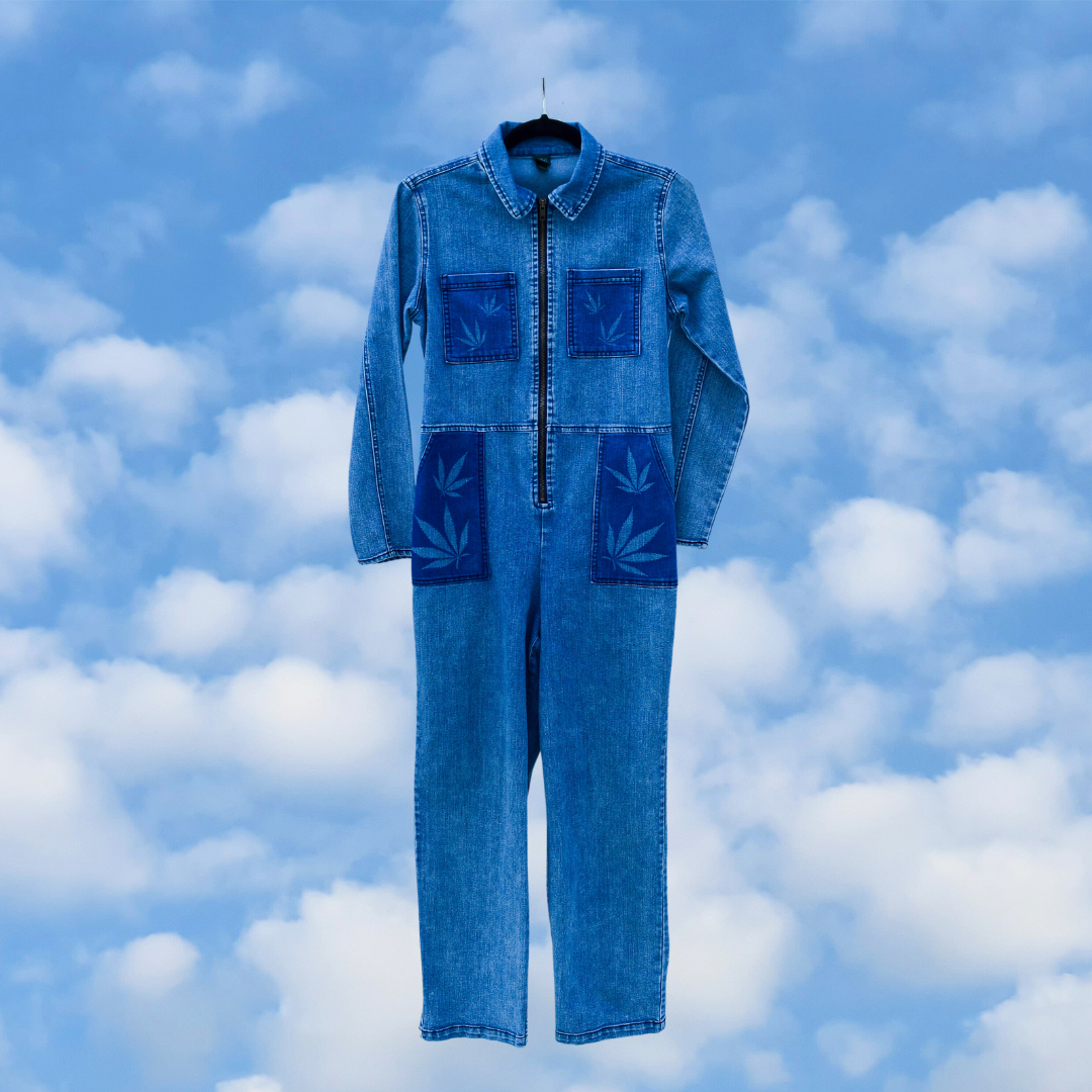 The jumpsuit measures 31" waist, 27" inseam, 28" torso, and 17” pit to pit, ensuring a comfortable fit for a range of body types. The cannabis-inspired design is hand-dyed onto the denim, making each piece truly unique and one-of-a-kind.