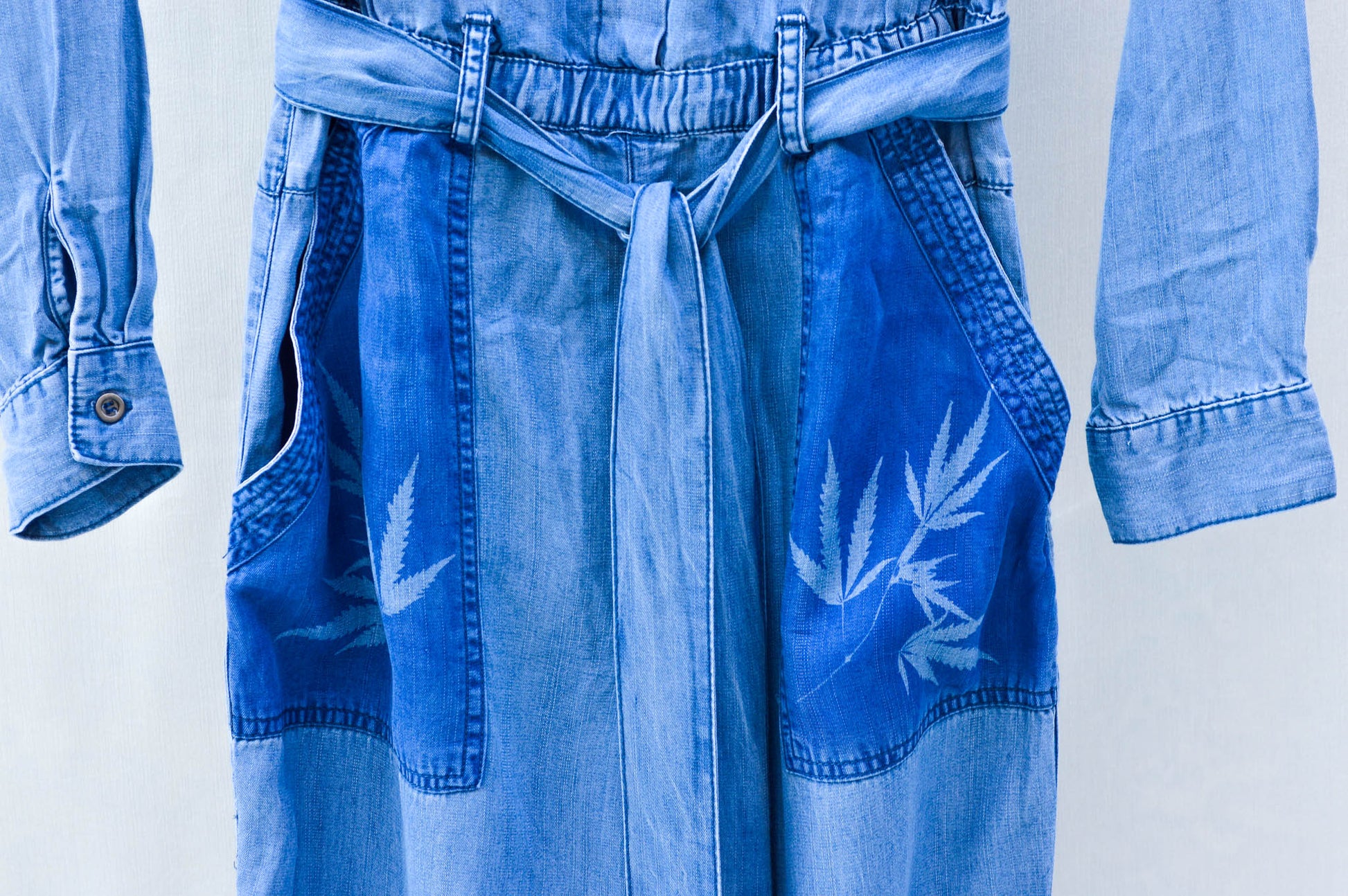 Introducing my one-of-a-kind upcycled denim jumpsuit, designed and dyed with unique real cannabis leaves to showcase your love for the plant. This jumpsuit is sustainably made using repurposed Velvet & Heart brand denim, ensuring that you're not only looking great but also doing your part for the environment.